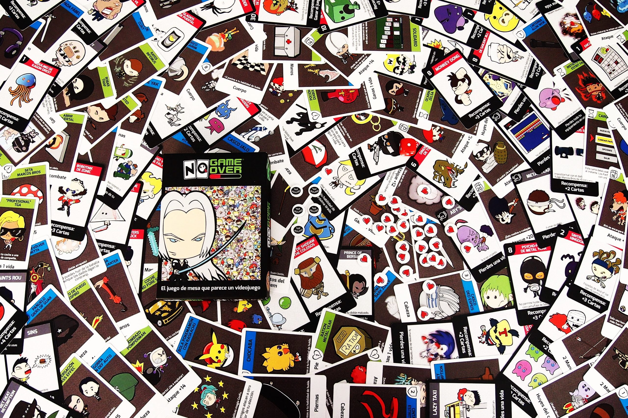 No Game Over es un juego de mesa de cartas que está inspirado en el mundo de los videojuegos, que va por su 6ª edición. En este juego de 2 a 6 jugadores tendrás que ser el último sobreviviente o ganar el total de vidas, mientras te puedes equipar con armas y armaduras como el casco de Jalo o Skairim, o la faldita del Wod of Gar.
